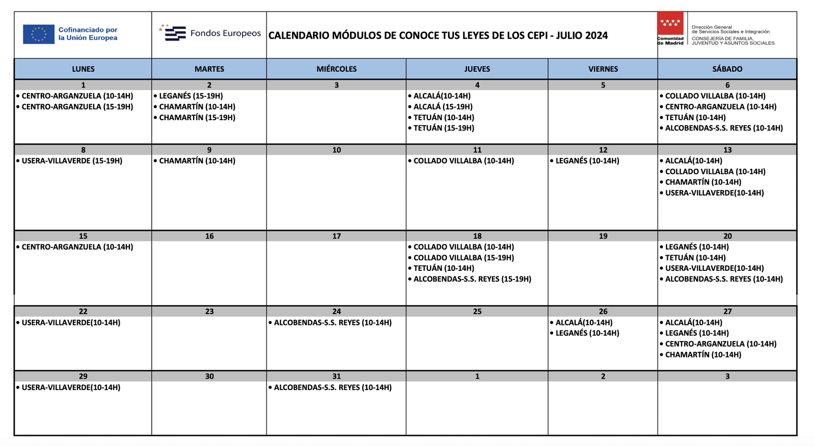 El objetivo de este programa es dotar a los nuevos madrileños de conocimientos sobre la sociedad española para facilitar su integración. Se imparten de forma continua y gratuita, según la programación adjunta, en los Centros de Participación e Integración de Inmigrantes (CEPI).